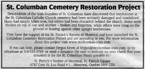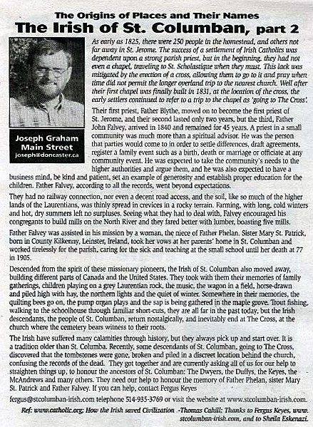 As early as 1825, there were 250 people in the homestead, and others not far away in St. Jerome. The success of a settlement of Irish Catholics was dependent upon a strong parish priest, but in the beginning, they had not even a chapel, traveling to St. Scholastique when they must. This lack was mitigated by the erection of a cross, allowing them to go to it and pray when time did not permit the longer overland trip to the nearest church. Well after their first chapel was finally built in 1831, at the location of the cross, the early settlers continued to refer to a trip to the chapel as ‘going to The Cross’.