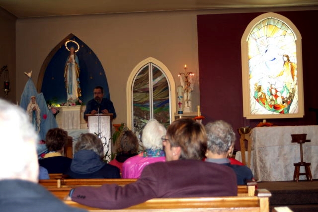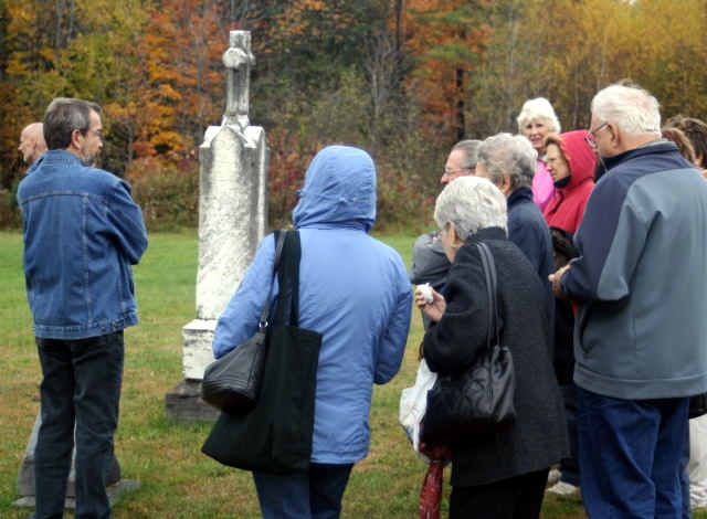 Arriving in St. Columban at around 10 a.m., Claude Bourguignon, our very own St. Columban Historian, was waiting in the Church parking lot to begin a tour of the area. Claude started with a visit to the parish church and then offered a great lecture about St. Columban – its people and history – from its founding until today. Everyone seemed to real enjoy this detailed and interesting presentation. Claude then escorted the visitors over to the cemetery, across from the Church and provided more details about the cemetery and the efforts of the descendants to raise the funds needed to build a monument to their early Irish ancestors.